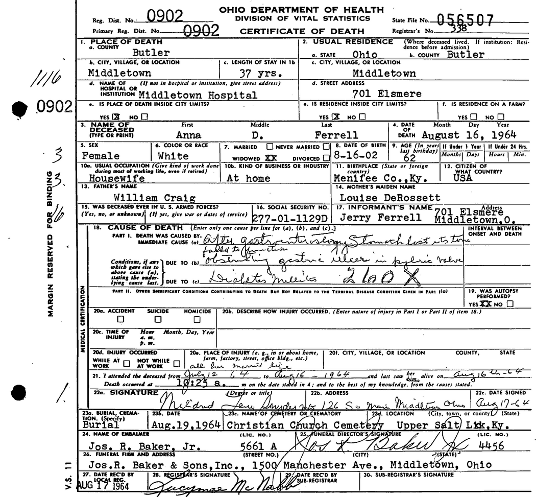 Death Certificate Anna Ferrell 1964 Death Certificate