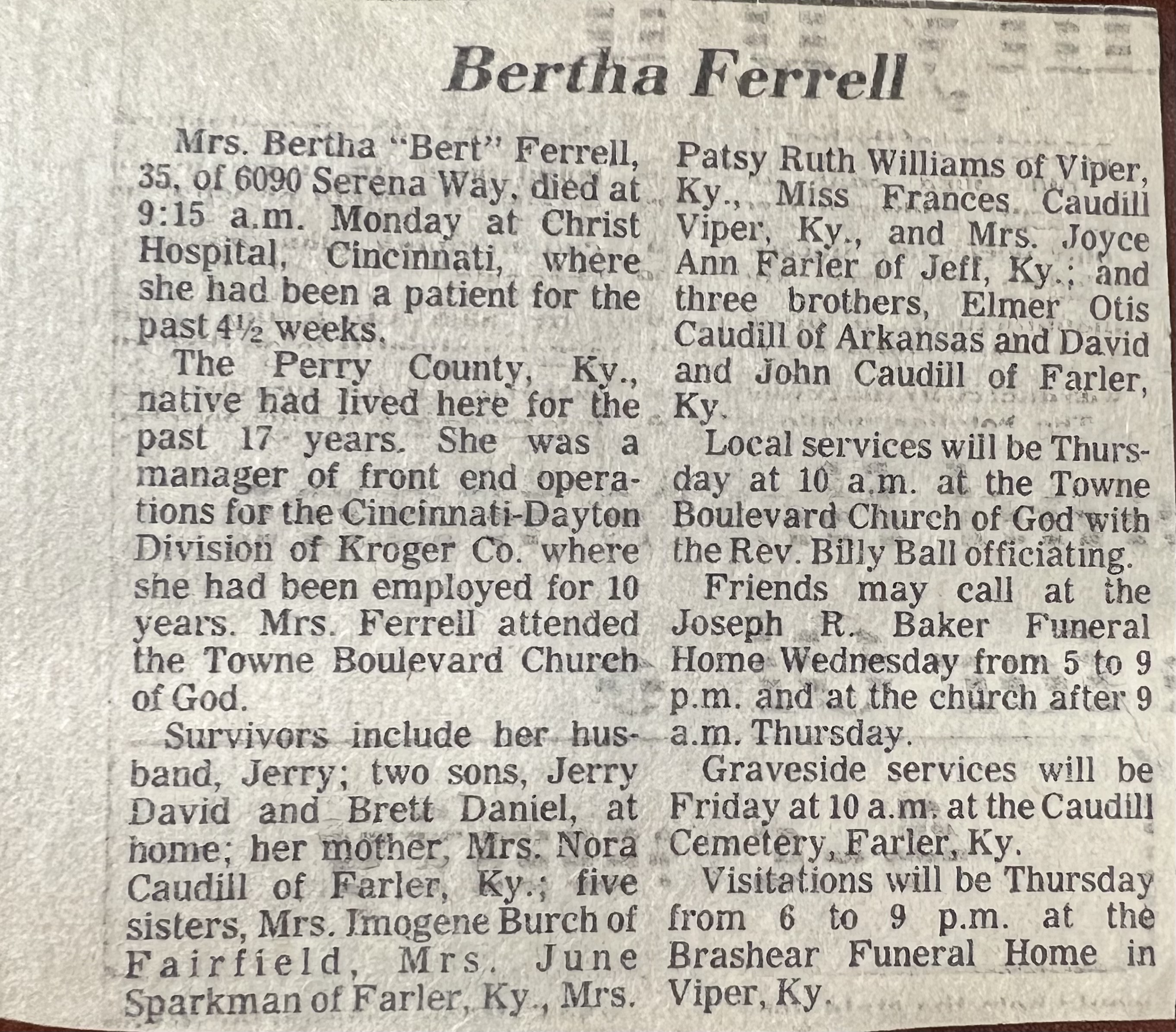 Bertha Ferrell Mrs. Bertha "Bert” Ferrell, 35, of 6090 Serena Way, died at 9:15 a.m. Monday at Christ Hospital, Cincinnati, where she had been a patient for the past 4 1/2 weeks. The Perry County, KY, native had lived here for the past 17 years. She was a manager of front end operations for the Cincinnati-Dayton Devision of the Kroger Co. where she had been employed fro the 10 years. Mrs. Ferrell attended the Towne Boulevard Church of God. Survivors include her husband, Jerry; two sons, Jerry David and Brett Daniel, at home; her mother, Mrs. Nora Caudill of Farler, KY; five sisters, Mrs. Imogene Burch of Fairfield, Mrs. June Parkman of Farler, KY, Mrs. Patsy Ruth Williams of Viper, KY, and Mrs. Joyce Ann Farler of Jeff, KY; and three brothers, Elmer Otis Caudill of Arkansas and David and John Caudill of Farler, KY. Local services will be Thursday at 10 a.m. at the Towne Boulevard Church of God with the Rev. Billy Ball officiating. Friends may call at the Joseph R. Baker Funeral Home Wednesday from 5 to 9 p.m and at the church after 9 a.m. Thursday. Graveside services will be Friday at 10 a.m at the Caudill Cemetery, Farler, KY. Visitations will be Thursday from 6 to 9 p.m at the Brashear Funeral Home in Viper, KY. | ||