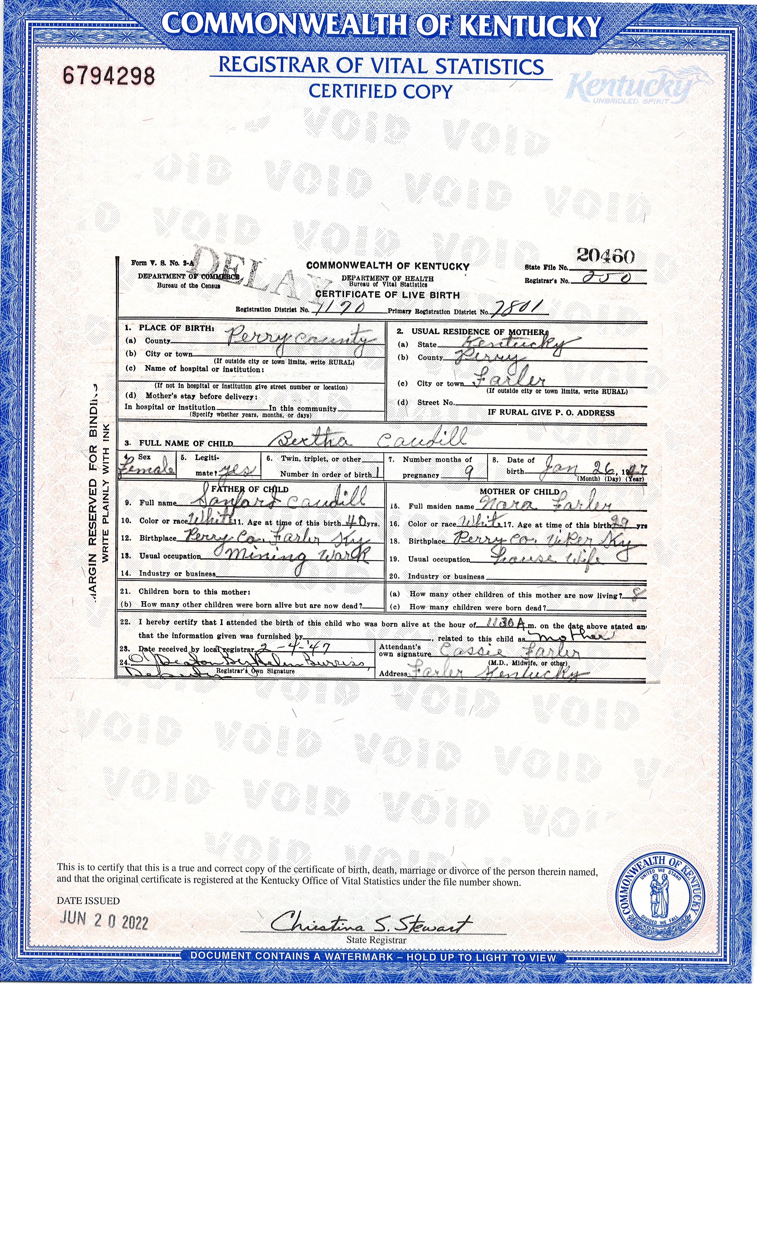 | Birth Certificate | 1947 Bertha Caudill Birth Certificate |