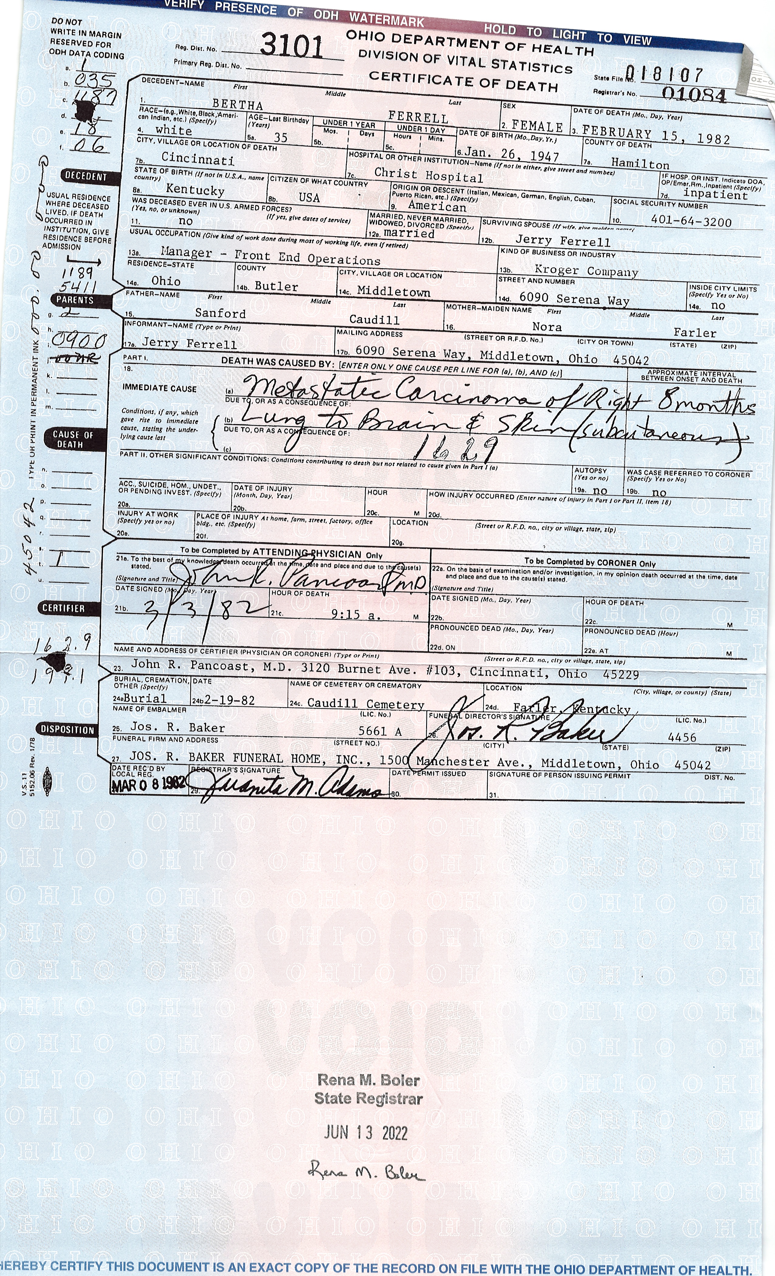 | Death Certificate | Bertha Caudill 1982 Death Certificate |