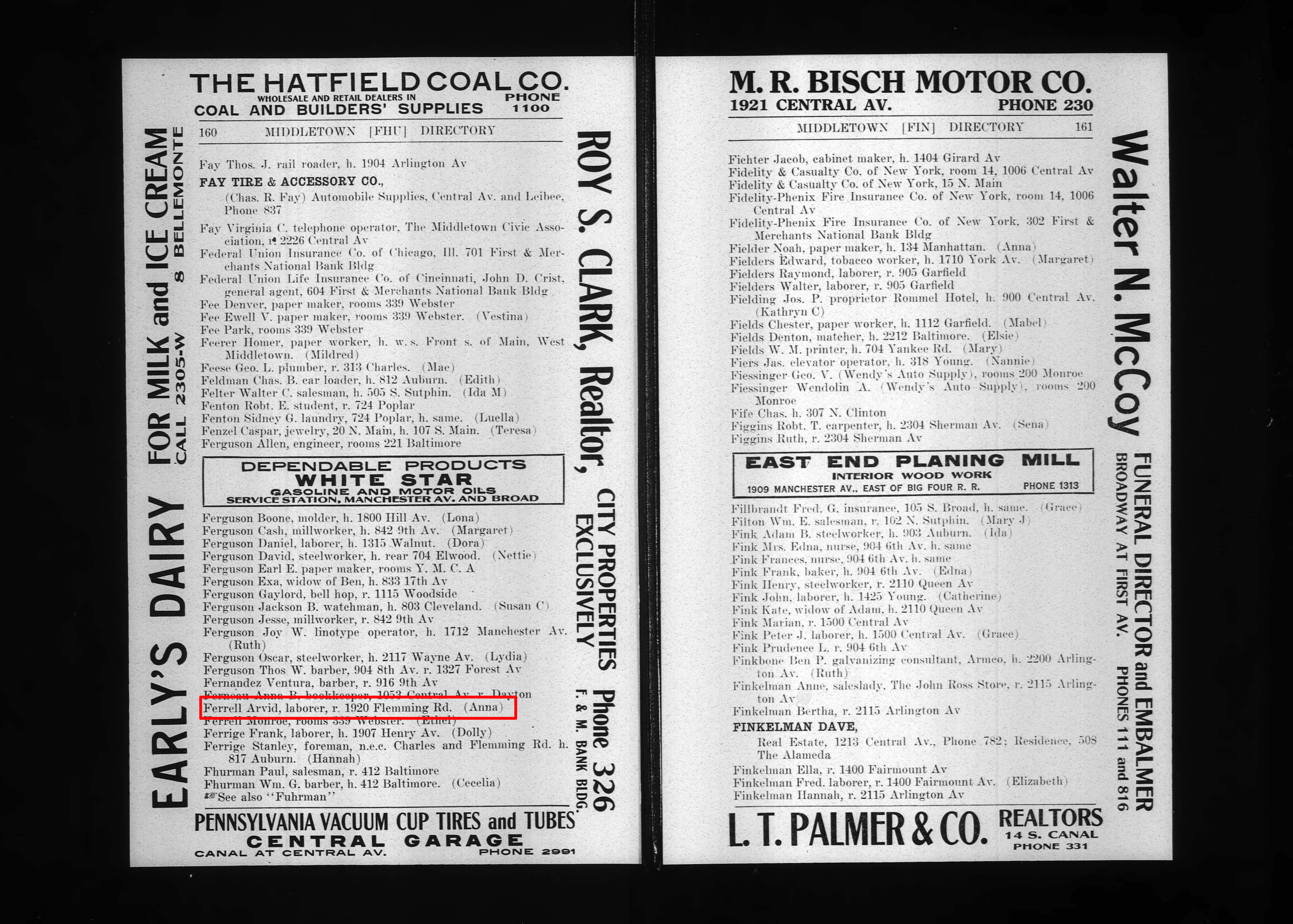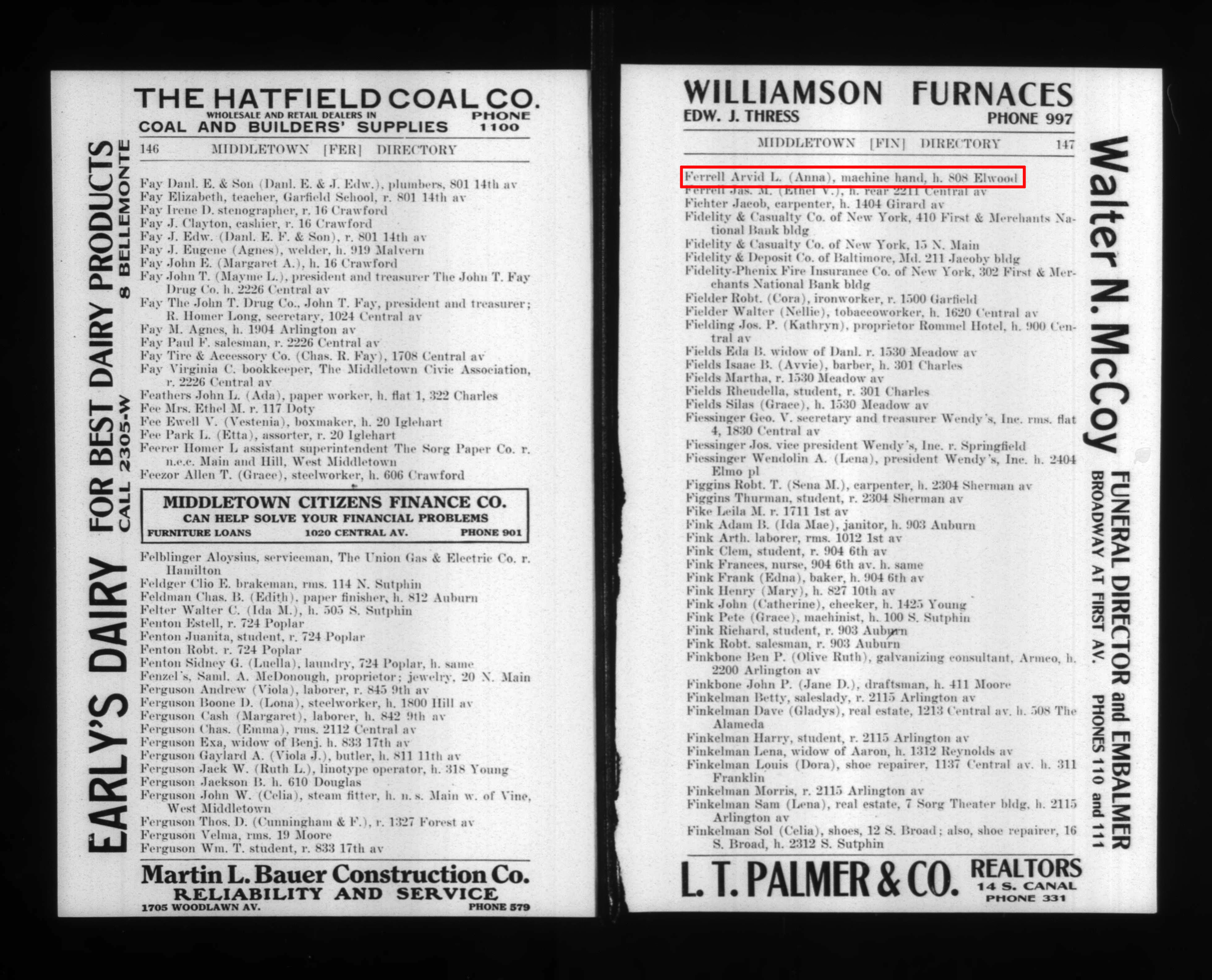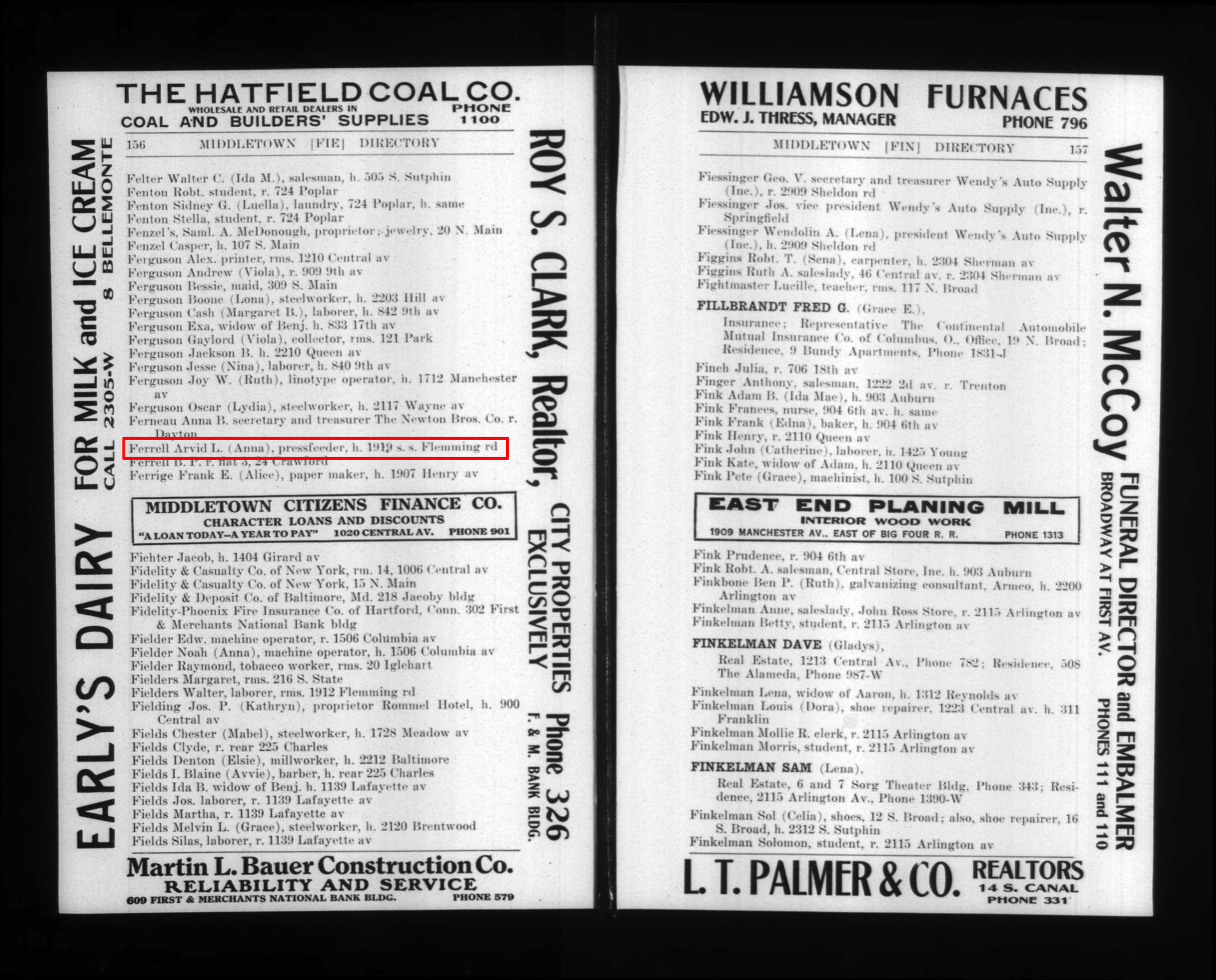 On top of the 1890 fire, somehow several of my key families get missed in several of the census' of interest. Arvid and Anna, my grandpa/grandma, are missing in 1930 in Middletown, OH. Middletown is a good-sized city by this time, and I have the City Directory entry for them for 1928, 1930, and 1933, so I know pretty solidly what street they were on. Using Steve Morse's Enumeration District Decoder, I found the ED that should be in... of course Fleming is the boundary of a couple of districts, but I looked in all three possibilities, and they're not there. In fact, I can't find any 1900 block Fleming Road entries, so it seems that section was just truly missed by the enumerator, as strange as that seems.